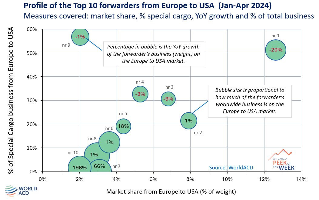 在本周的 "每周一瞥 "中,我们将举例说明货代公司的概况。在下图中,我们列出了欧洲至美国市场上排名前十的货代公司(2024 年 1 月至 4 月)。我们对每家货代公司进行了四项衡量:市场份额、% 特种货物、年同比增长率和欧洲至美国航线的重要性(占货代公司总业务量的 %)。散点图清楚地显示了顶级货运代理在这一市场中的不同情况。