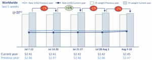 第32周的下降显示,过去两周与其之前两周(双周环比)货量小幅下降了1%,趋势变差。然而,第32周与去年同期(同比)相比,除欧洲和非洲(均保持稳定)外,所有地区的计费重量却均有所上升,其中亚太地区(+7%)和中南美洲(CSA,+6%)的增幅最大。