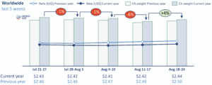 与去年同期类似,全球航空货运量在连续三周下滑后,环比反弹。继第 31 周和第 32 周下降 1%、第 33 周下降 6% 之后,第 34 周(8 月 18 日至 24 日)全球计费重量环比增长 4%。整体价格连续第二周上涨(上涨 1%),但价格水平仍低于去年同期。