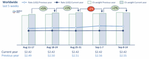 在全球范围内,货运量在第37周回升,环比增长2%,中东和南亚的出口货运量下降(环比下降4%),但北美的货运量反弹(环比增长11%)完全抵消了这一跌幅,特别是美国在9月1日的劳动节公众假期之后。同时,来自亚太地区的货运量(环比增长2%)也有所增加。
