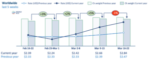 由于全球多家主力货运航司仍面临严重的运力与运营中断,第12周(3月16日至22日)全球市场空运平均运价(含附加费)在前一周大涨10%、第10周上涨8%的基础上,周环比再度上涨7%至每公斤2.84美元。