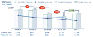 与往年类似,运力在去年第四季度的峰值水平被大幅削减后,货机运力有所回升。第二周货机运力比前周恢复超过15%,但与12月中旬相比,整体航空货运运力仍下降约7%。