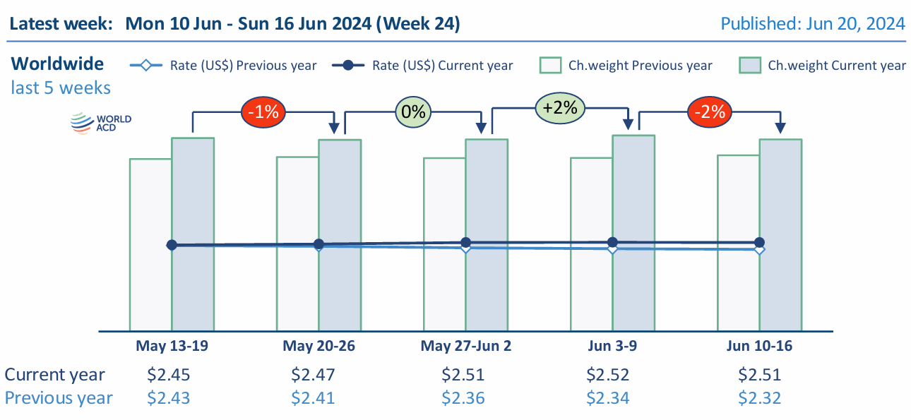 尽管过去一周(第 24 周,6 月 10 日至 16 日)全球总吨位下滑了-2%,但平均运价基本保持稳定,为每公斤 2.51 美元,与去年同期相比上涨了 +8%,且显著高于新冠疫情前的水平(与 2019 年 6 月相比上涨了 +42%),这是基于WorldACD 数据涵盖的每周超过 450,000 笔交易得出的结论。结合过去两周(第 23 和第 24 周)的数据,我们发现运价和吨位都比前两周上涨了 1%(两周环比)。