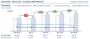 在定价方面,第 4 周的全球平均价格为每公斤 $2.33 美元,比去年同期的高位低了-20%,但仍大大高于科维德事件前的水平(与 2019 年 1 月相比高出 31%)。