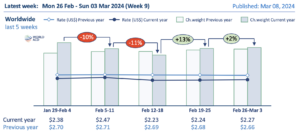 在全球范围内,第 9 周的平均价格为每公斤 $2.27 美元,比去年同期低 16%,其中除欧洲和北美地区外的价格分别下降了 -29% 和 -20% ,除亚洲地区外的价格下降了 12%,而除中东和非洲地区外的价格则同比上涨了 +13% - 这是唯一一个价格上涨的原产地。与前两周相比,中东和非洲以外地区的运价上涨了 7%。