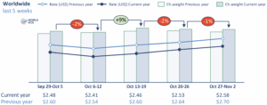 Looking at this year’s most-volatile market, Asia Pacific to the US, spot rates to the US from China, Hong Kong and Japan rose for the third consecutive week in week 44, although all three remain below their levels this time last year – as they have for the last three months. China to the US spot prices edged up by a further +2% in week 44 (26 October to 4 November), WoW, to $5.59 per kilo, their highest level this year, while Hong Kong to the US and Japan to the US spot prices rose by +5% and +11% respectively, to $5.49 and $6.15 per kilo. But those spot rates are -5%, -12%, and -7%, respectively, below their equivalent levels this time last year, when rates had already started to surge in the lead up to winter holidays including Thanksgiving, Black Friday, Cyber Monday, and Christmas.