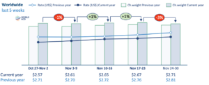 Average worldwide rates increased again by +1% WoW, similar to the trends of previous recent weeks, and as is typical for this period of the year, while the YoY gap also remained more or less stable (at -4%). Within these patterns, average worldwide spot rates increased further in week 48, by +3% WoW, to $2.96 per kilo, with increases from MESA (+3%), and +2% increases from Asia Pacific, Europe, and CSA origins partially offset by WoW declines from North America (-11%) and Africa (-4%), taking average worldwide spot rates -6% below their level in the equivalent week last year.