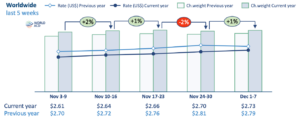 On a worldwide basis, tonnages edged up slightly (+1%) from week 48 to week 49 – despite a small drop (-1%, WoW) in volumes from Asia Pacific origins which, as usual, have been the biggest driver of the end-of-year ramp-up of demand and pricing, even if this year’s ‘peak season’ has been less spiky than some. However, the small worldwide WoW increase in week 49 was almost entirely driven by the recovery of US tonnages from the effects of Thanksgiving the previous week: tonnages from North America were up +15%, WoW, after falling by -15% in week 48. Without that recovery in US traffic, worldwide volumes would have been flat instead of +1%.
