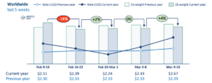 According to the more than 500,000 weekly transactions covered by WorldACD’s data, average global full-market air cargo rates rose by a significant +10%, week on week (WoW), in week 11 (9 to 15 March) to US$2.67 per kilo (including surcharges) after surging +8% the previous week, as carriers, freight forwarders, and cargo owners responded to disrupted markets, constrained air cargo capacity, alternative flight routings, demand backlogs, uncertainty, and higher jet fuel prices.