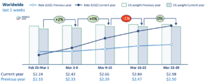 Airlines in the northern hemisphere switch to their summer schedule by the start of April, which should begin to impact capacity and pricing in a number of markets in week 14. However, the ongoing conflict in the Middle East will likely have a much larger impact on demand and pricing.