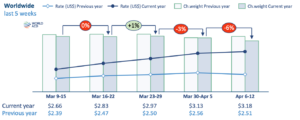 According to the latest weekly figures from WorldACD Market Data, average worldwide spot rates rose by a further +3% in week 15 (6 to 12 April) to US$3.76 per kilo, taking them +37% higher than this time last year and more than +40% up compared with their level at the end of February, when the US and Israel launched military strikes on Iran.