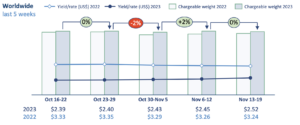 Worldwide average rates are currently -23% below their levels this time last year, at an average of US$2.52 per kilo in week 46, although they remain significantly above pre-Covid levels (+38% compared to November 2019).