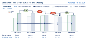 Year-on-year (YoY) comparisons show a -4% decrease in total worldwide tonnages for weeks 7 and 8, combined, compared with last year, driven downwards by a -11% drop ex-Asia Pacific and partially offset by a +27% increase ex-Middle East & South Asia.